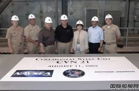 2005年8月11日,CVN21航母首塊鋼板切割儀式。當(dāng)時的母公司還是諾斯羅普?格魯門,CVN21還沒有被命名為福特級。