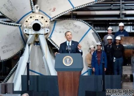 2013年2月26日,奧巴馬總統(tǒng)訪問紐波特紐斯造船廠,他的身后是福特號航母的推進(jìn)器,旁邊是一艘弗吉尼亞級核潛艇的艇首艙。